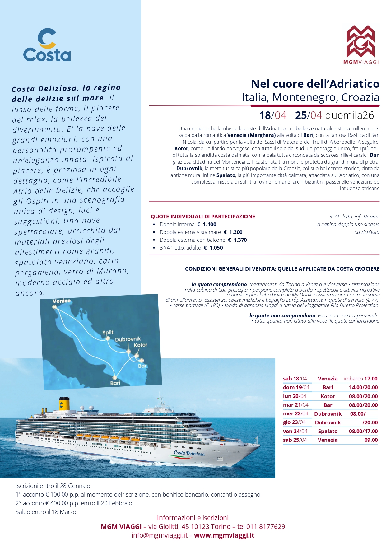 Dal 18/04 - 25/04 2026 con la nave Deliziosa Costa Crociere, una crociera che lambisce le coste dell’Adriatico, tra bellezze naturali e storia millenaria. Si salpa dalla romantica Venezia (Marghera) alla volta di Bari, con la famosa Basilica di San Nicola, da cui partire per la visita dei Sassi di Matera o dei Trulli di Alberobello. A seguire: Kotor, come un fiordo norvegese, con tutto il sole del sud: un paesaggio unico, fra i più belli di tutta la splendida costa dalmata, con la baia tutta circondata da scoscesi rilievi carsici; Bar, graziosa cittadina del Montenegro, incastonata tra monti e protetta da grandi mura di pietra; Dubrovnik, la meta turistica più popolare della Croazia, col suo bel centro storico, cinto da antiche mura. Infine Spalato, la più importante città dalmata, affacciata sull’Adriatico, con una complessa miscela di stili, tra rovine romane, archi bizantini, passerelle veneziane ed influenze africane