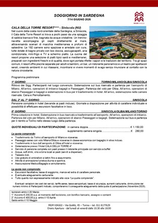 Dal 07/06 - al 14/06 2026 Presso la struttura CALA DELLA TORRE RESORT**** - Siniscola (NU), nel cuore della costa nord-orientale della Sardegna, a Siniscola, il Cala della Torre Resort si trova a pochi passi da una spiaggia di sabbia bianca e fine, bagnata da acque cristalline. Un treninonavetta accompagna gli ospiti direttamente al mare, attraversando scenari di macchia mediterranea e profumi di salsedine. Le 192 camere sono spaziose e arredate con cura, tutte dotate di bagno privato con box doccia, asciugacapelli, aria condizionata, minifrigo e TV a schermo piatto. La cucina del resort propone una selezione di piatti tipici sardi e mediterranei, preparati con ingredienti freschi e di qualità, dove ogni portata riflette i sapori e le tradizioni del territorio. Tra gli spazi comuni, il resort offre piscine separate per adulti e bambini, un bar, un ristorante panoramico e un teatro per spettacoli serali, creando ambienti in cui rilassarsi, incontrarsi e vivere momenti di svago senza rinunciare al contatto con la natura circostante.